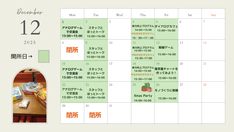 12月は8日(月)と年末の29日(月)・30日(火)が閉所となります。