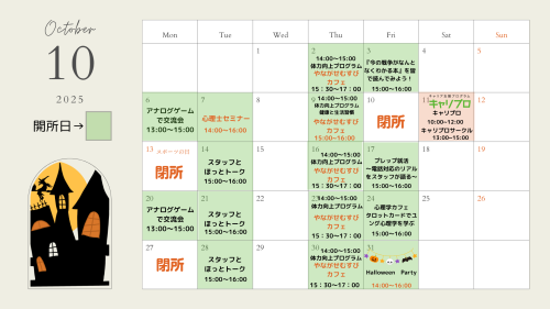10月も基本的には月・火・木・金の13時~17時に開所します。