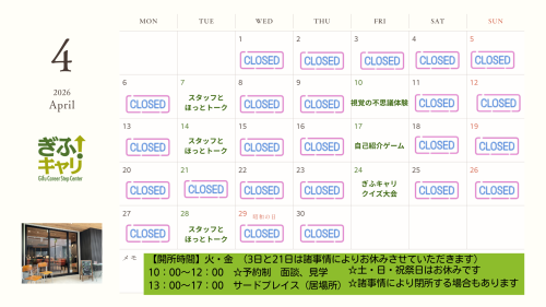 ※これまで開所していた月曜・木曜は、4月中はお休みとなります。